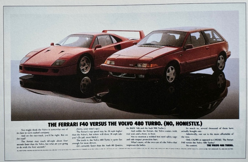 Also, Volvo’s original press ad campaign for the 480 was very punchy at the time. Photographed next to a Ferrari F40 and waxing lyrical about how the 480’s top speed was ‘more than adequate’.